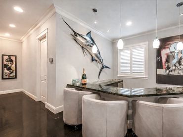 Designed and built by the current owner, this sophisticated 4-bedroom, 4-bath home blends classic island architecture with modern luxury living. Bamboo flooring, rich mahogany accents, detailed crown, door, and base moldings, along with coffered and tongue-and-groove ceilings and authentic Bahama shutters, create a warm yet refined ambiance throughout. CBS construction, impact windows and spray foam insulation speak to the quality quality of construction.